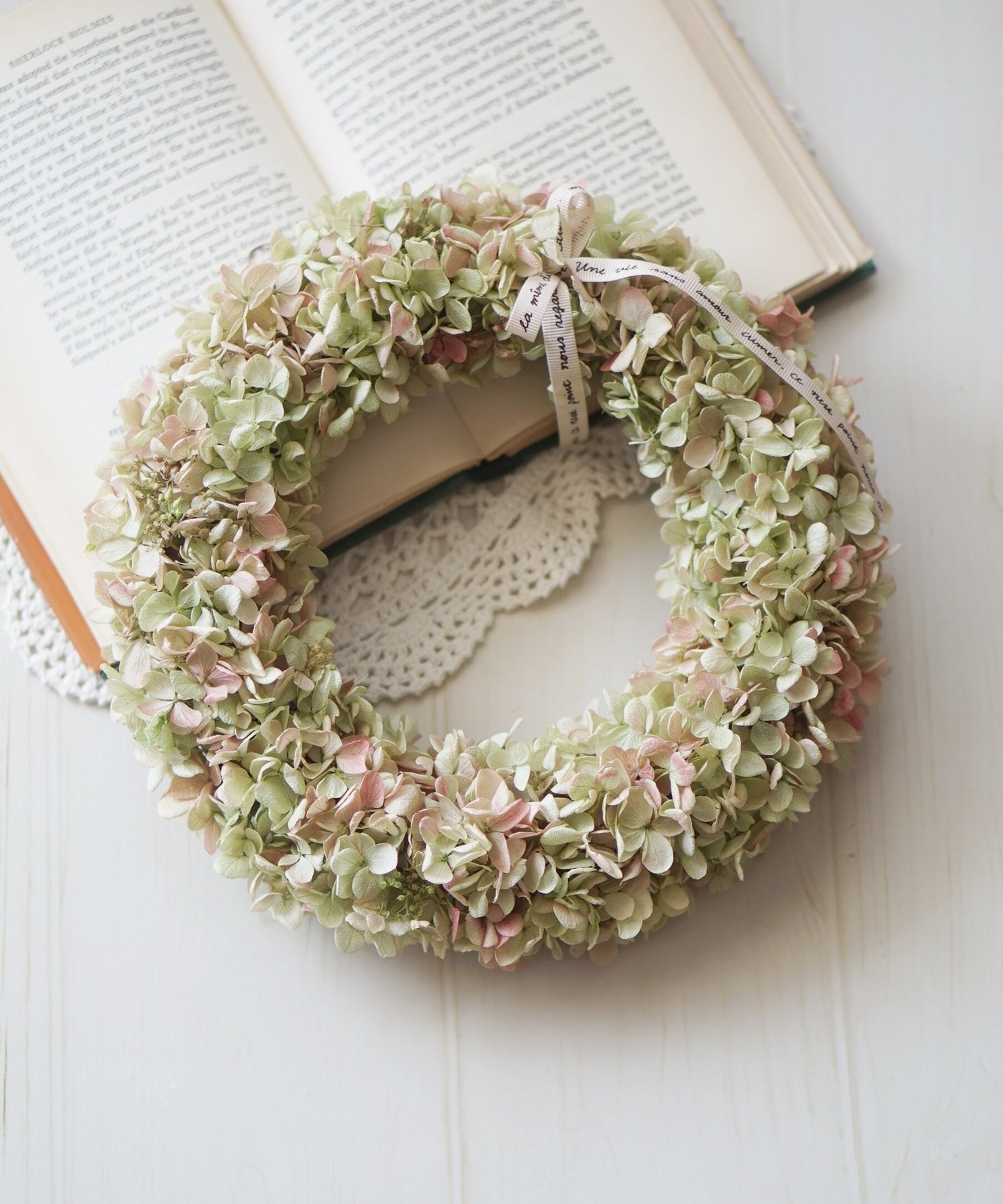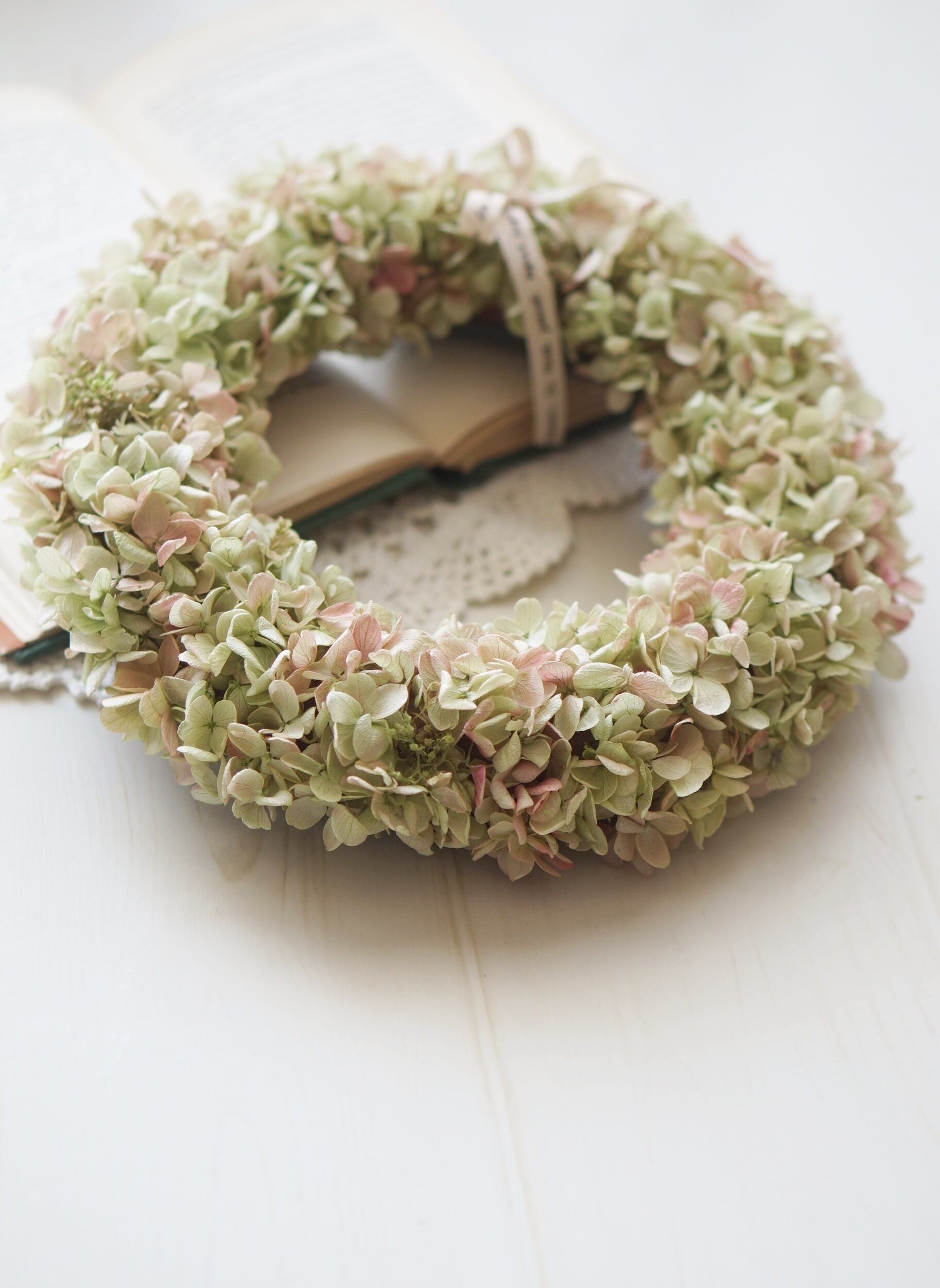 プリザーブドアジサイを使ったシンプルでナチュラル感たっぷりのリースです。