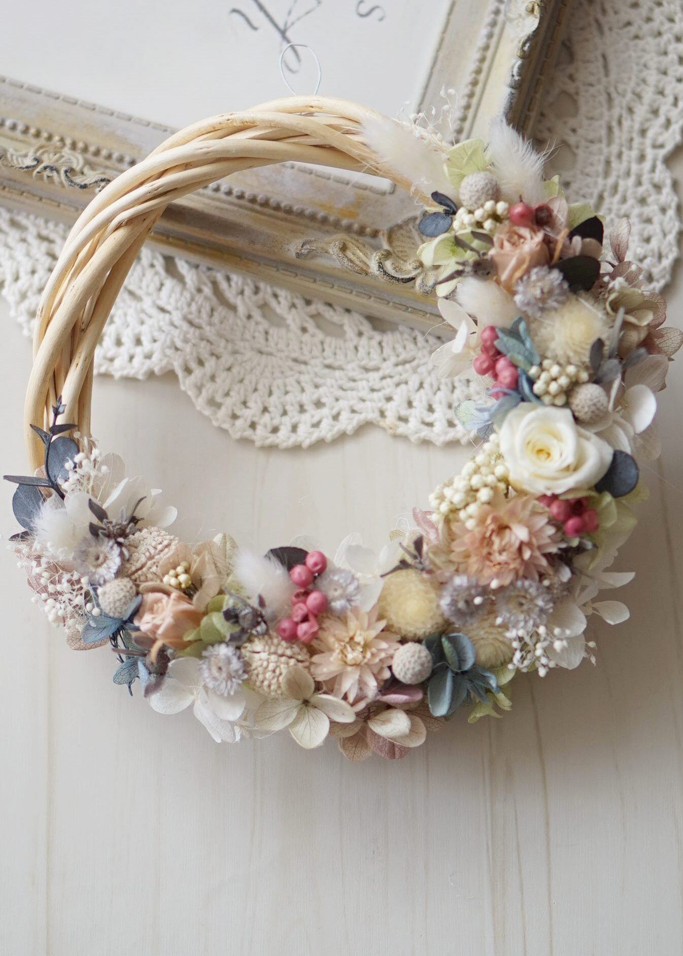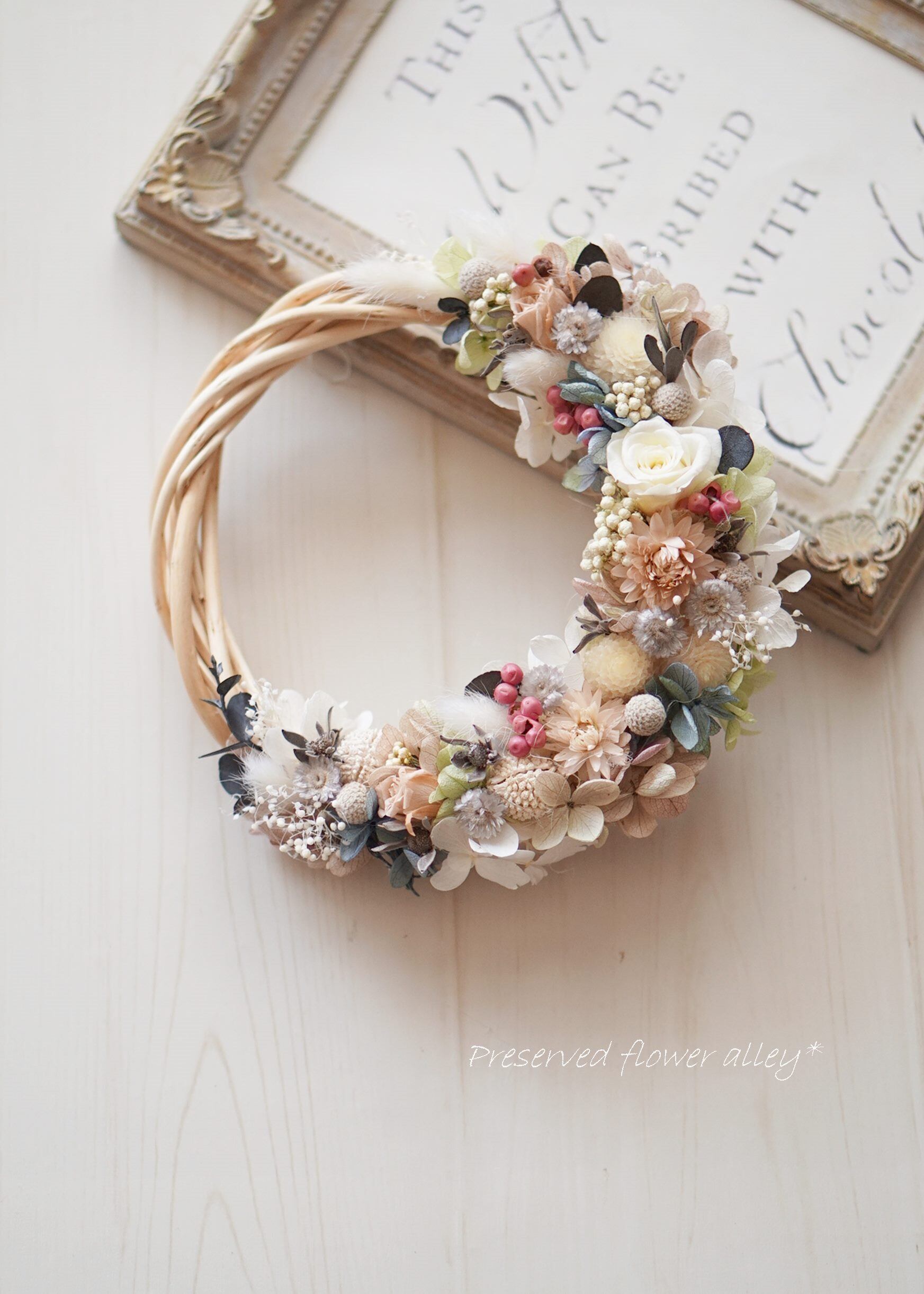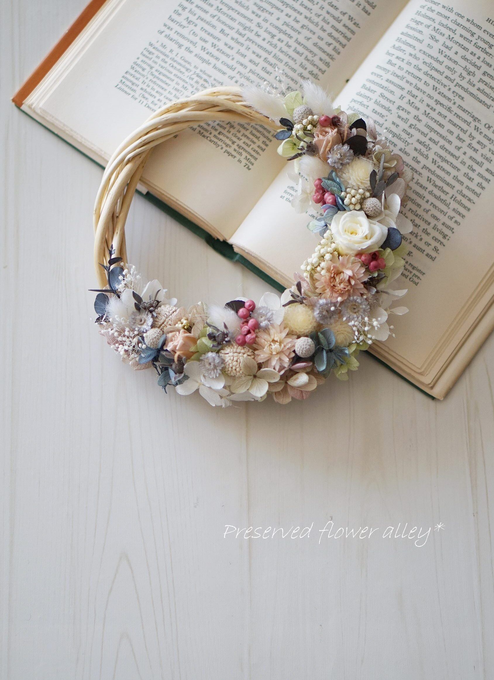 プリザーブドフラワーをメインにドライフラワーを合わせたハーフリースです。