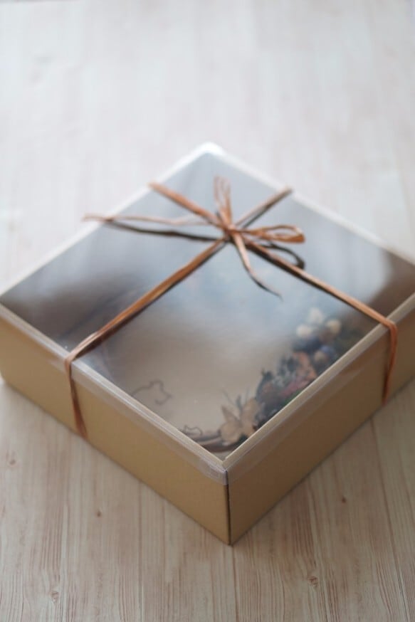 ギフト用ボックス(20cm×20cm×7.5cm)(4枚目の写真を参照ください。中身は別の商品です。)にお入れして、リボンをかけてお届けします。