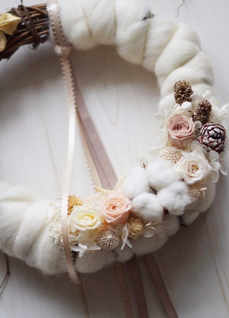 サンキライリースベースに、ふわふわあったかな羊毛、プリザーブドローズやアジサイ、木の実等をアレンジしました。