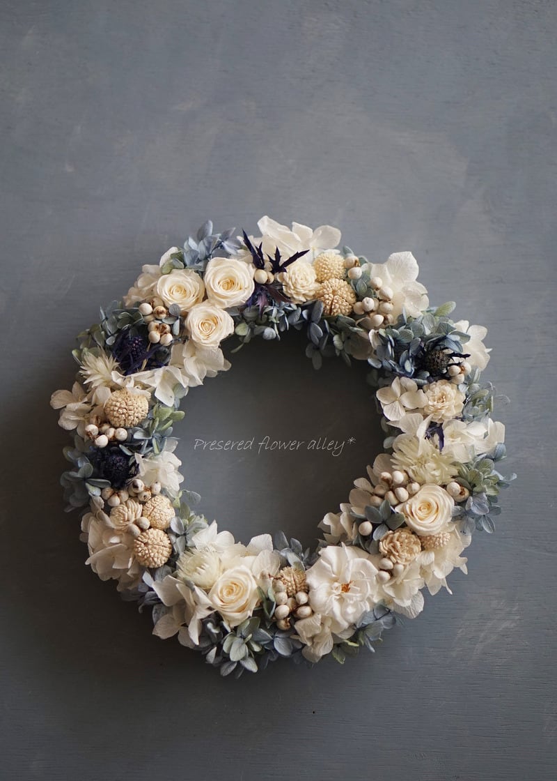 シックなブルーのプリザーブドアジサイをベースに、プリザーブドローズ、控えめなラメがかかったムタンバナッツやソーラージニアなどを加えて、上品なリースに仕上げました