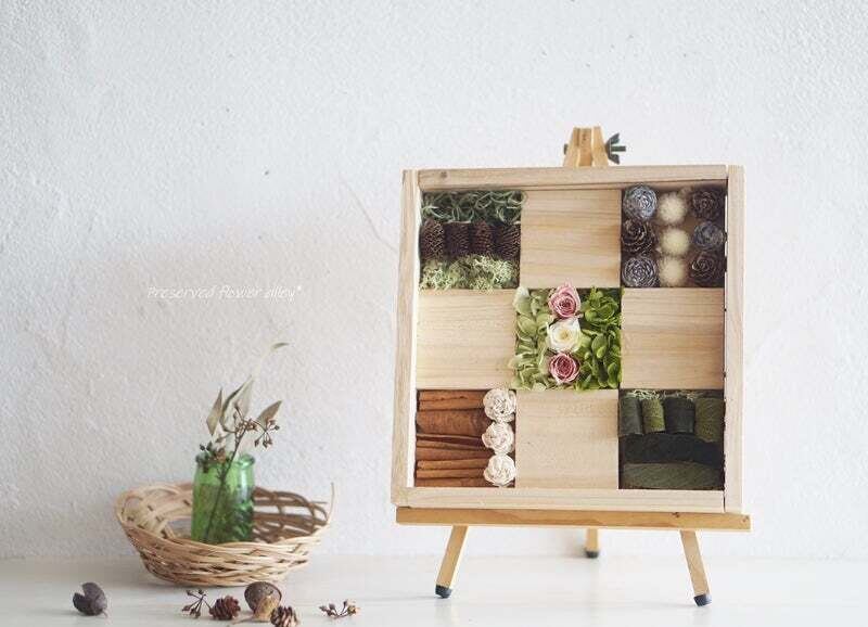 ナチュラルな木製市松フレームに、プリザーブド素材や木の実を詰め込んだ、お洒落で個性的なアレンジです。